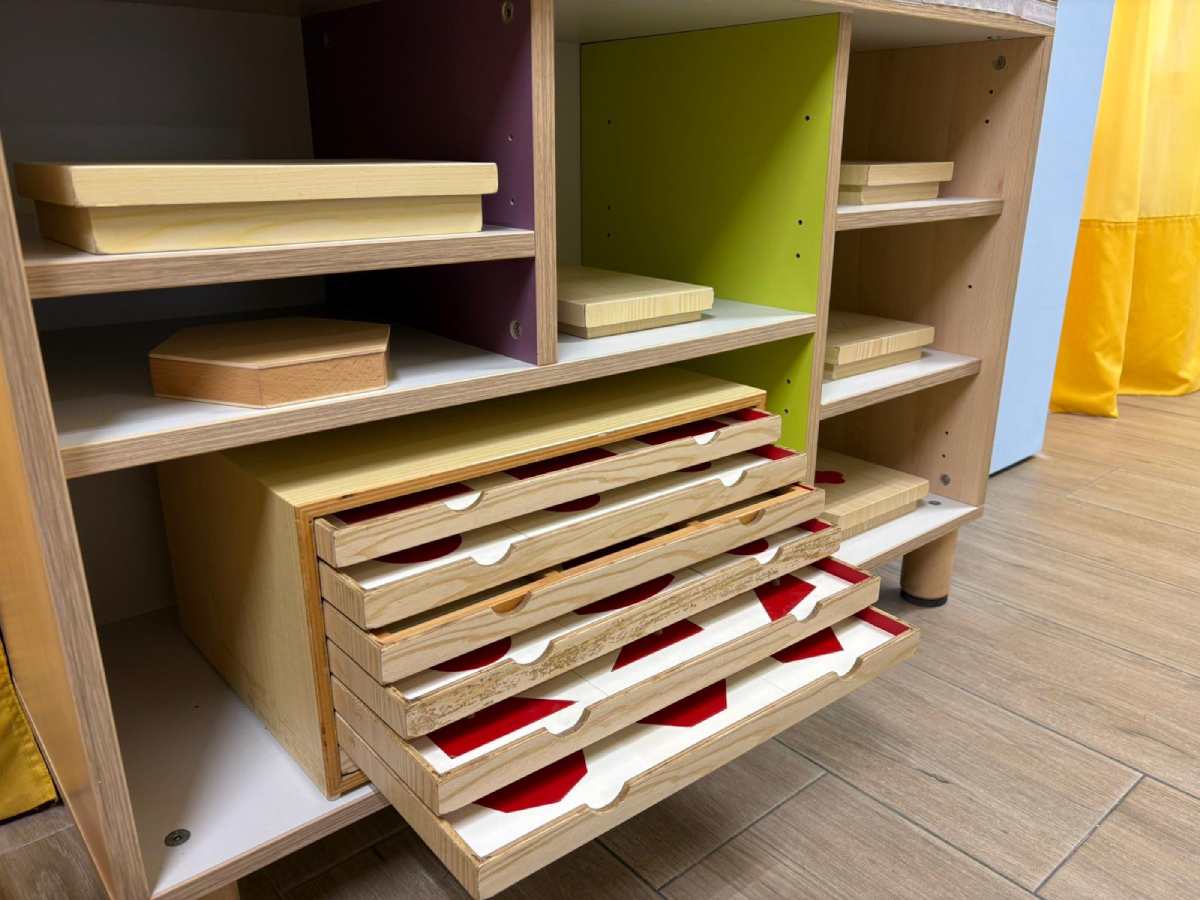 Tutto il materiale è disposto ordinatamente, direttamente accessibile da parte dei bambini e questo perchè “La scuola deve diventare il luogo dove il bambino puo’ vivere nella sua libertà.”